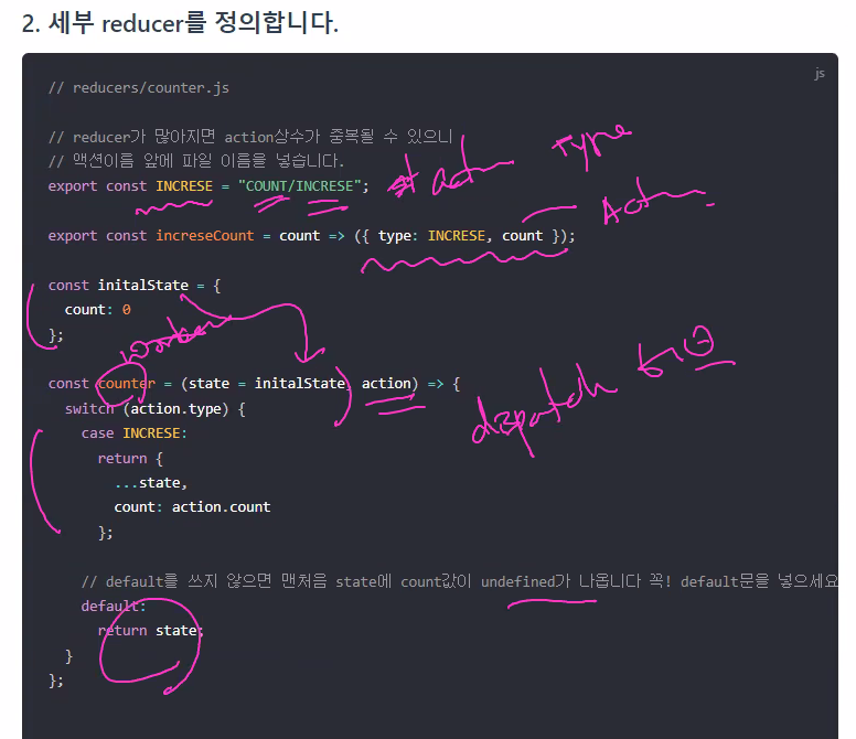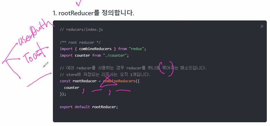→ 리듀서(refuce)는 업데이트 로직을 정의하는 함수(store에 들어갈 state와 state를 바꿀 함수를 정의하는 곳)