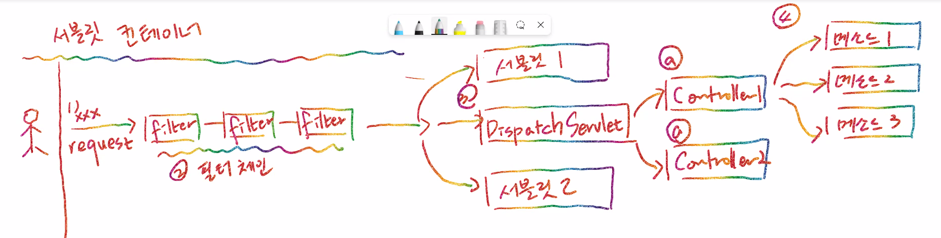 → 3. DispatchServlet / 또 다른 서블릿도 존재할 수 있음 → Controller / 업무마다 하나씩 존재
