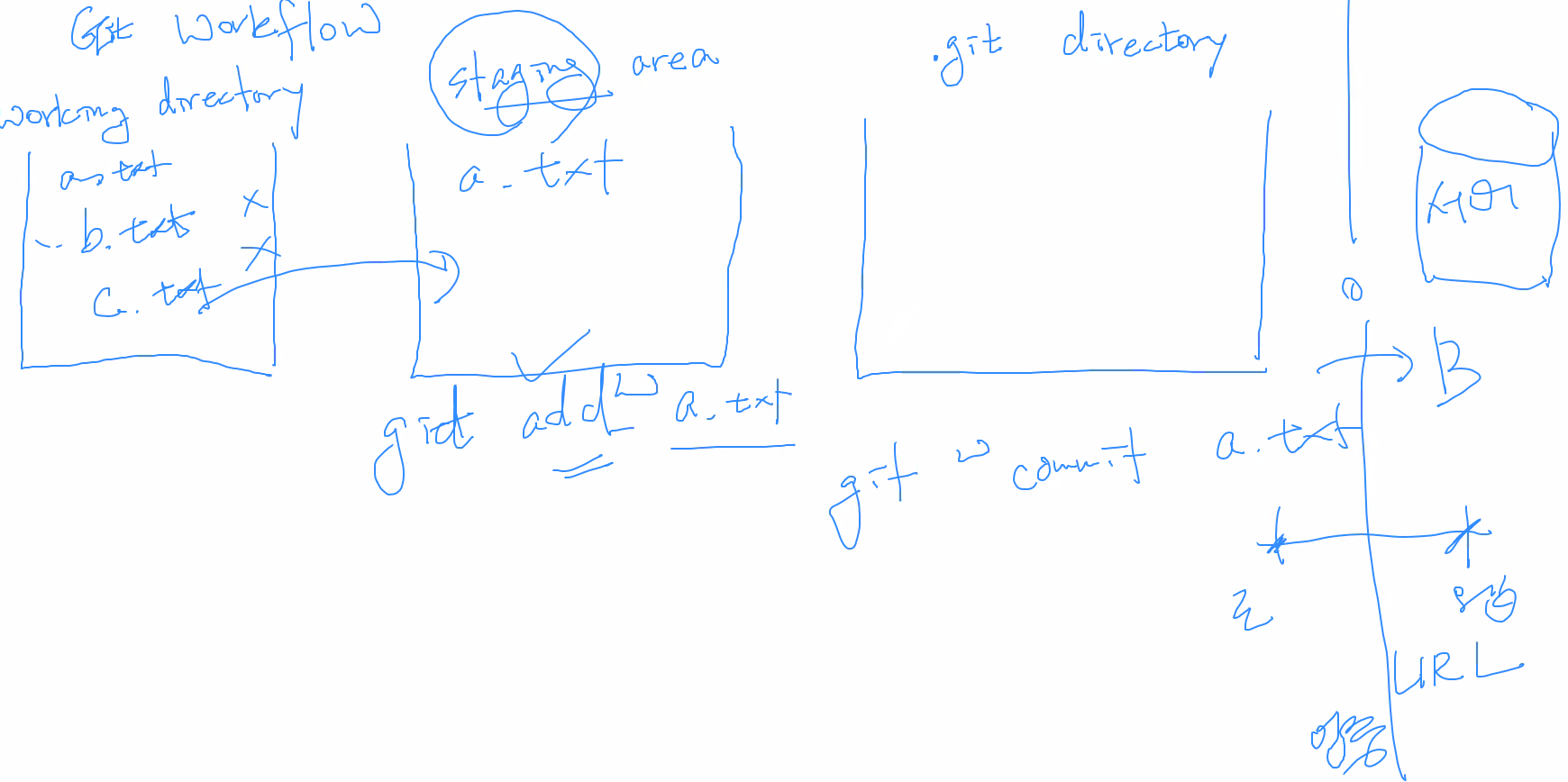 working directory(이하 w.d) → staging area(s.a) →git diregtory(g.d) ==⇒ git server