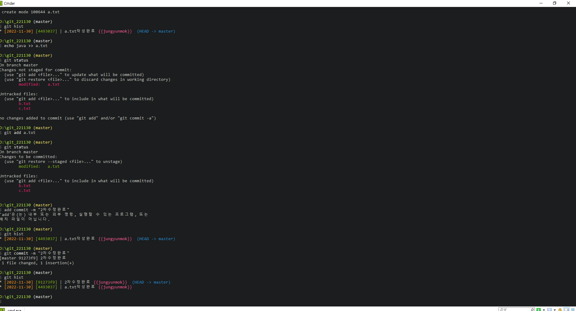 echo java >> a.txt(내용을 java로 변경/add와 commit 다시 해줘야 함)