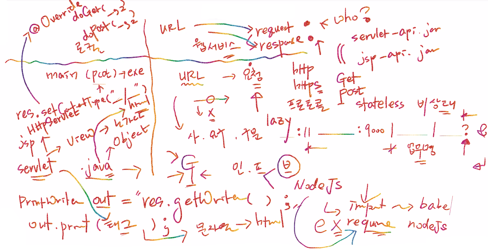 HttpServlet상속받아야 서블릿 → @Override 가능 doGet(요청, 응답), doPost(req, res)